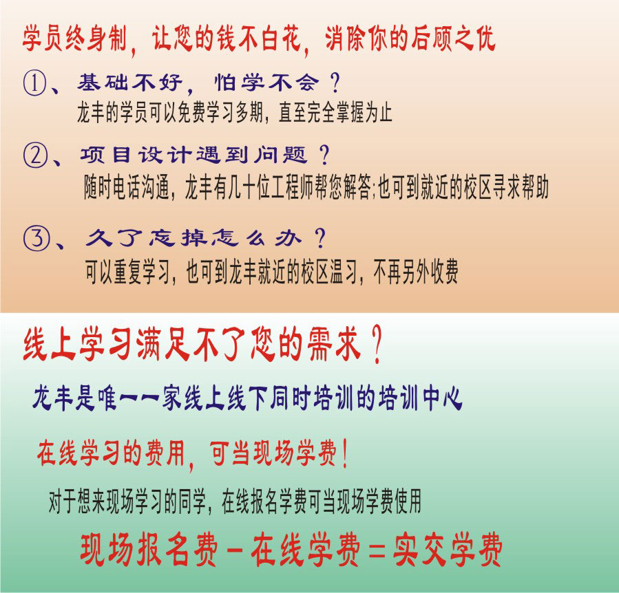 龍豐所屬學(xué)員都可以在龍豐 任何一個校區(qū)重新學(xué)習(xí),或?qū)で蠹夹g(shù)支持, 不再收費(fèi)